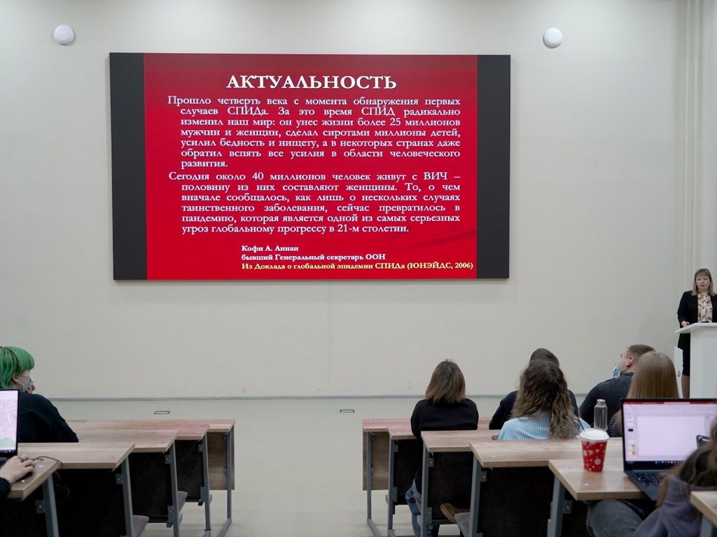 В рамках Недели борьбы со СПИДом состоялась встреча студентов ЮГУ с врачом акушером-гинекологом регионального Центра профпатологии. Лекция была направлена на информирование молодежи о ключевых аспектах ВИЧ-инфекции и других инфекций, передающихся половым путем.