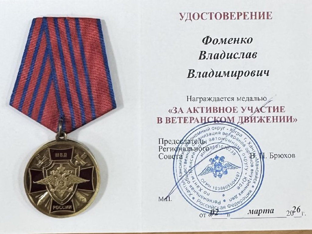 Депутат Думы Югры Владислав Фоменко удостоился медали «За активное участие в ветеранском движении».