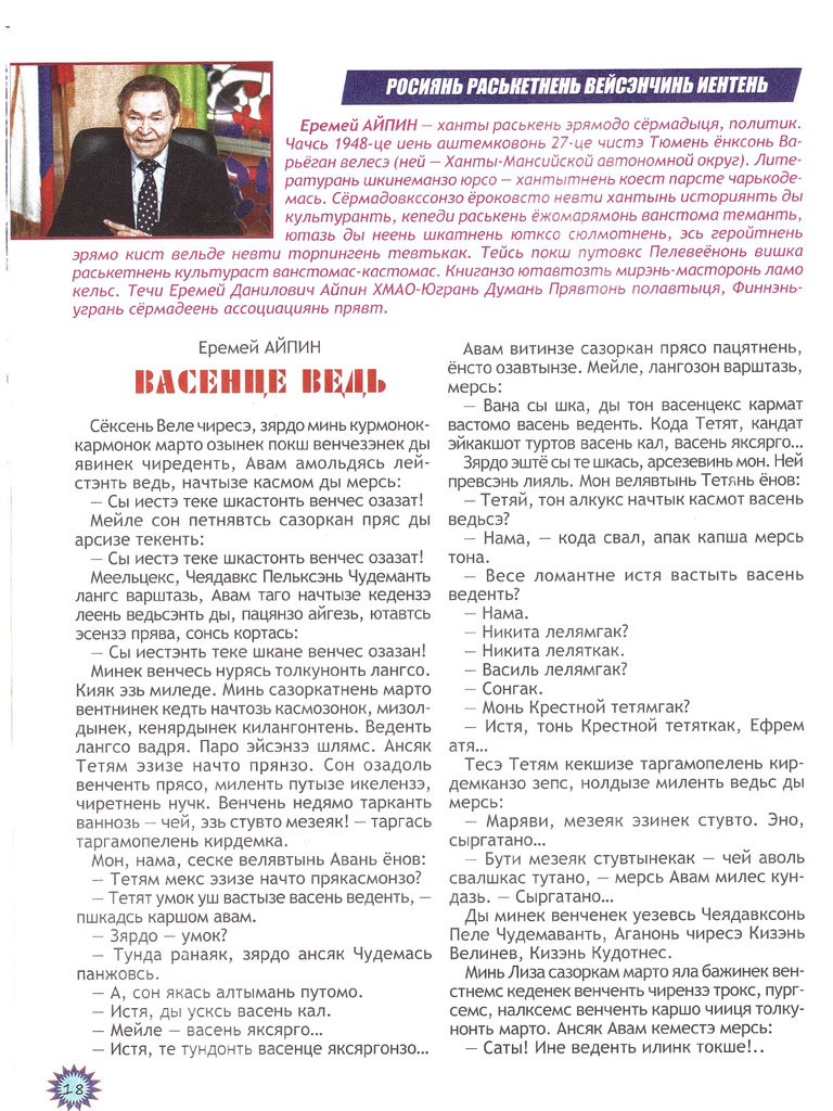 В преддверии IV Конференции финно-угорских писателей, которая состоится в Югре с 7 по 12 сентября 2026 года, в одном из старейших периодических изданий Республики Мордовия опубликован рассказ Еремея Айпина «Первая вода!» на эрзянском языке.