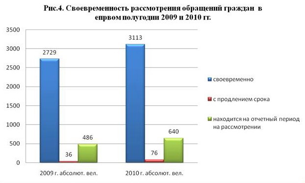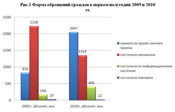 Как видно и таблицы и рисунков в 1 полугодие 2010 года в адрес депутатов Думы Ханты-Мансийского автономного округа - Югры поступило 3 821 обращение граждан, что на 17,5 процента превышает число обращений за аналогичный период прошлого года (3 251).