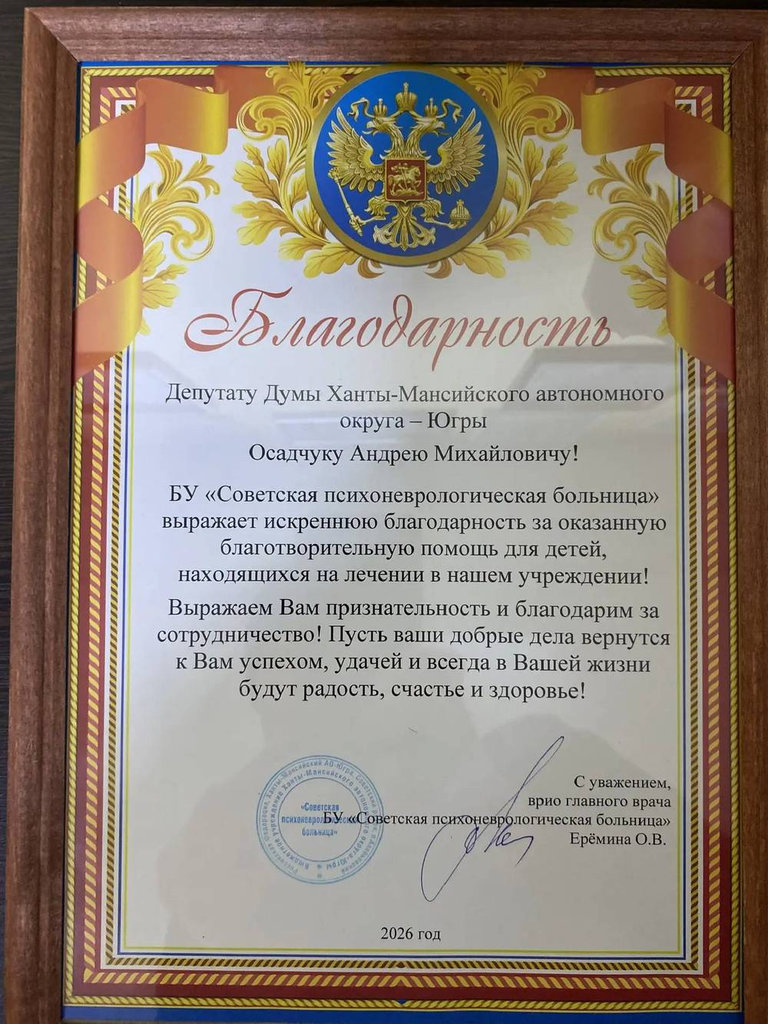 Коллектив Советской психоневрологической больницы поблагодарил депутата Думы Югры Андрея Осадчука за благотворительную помощь детям, проходящим лечение в учреждении.