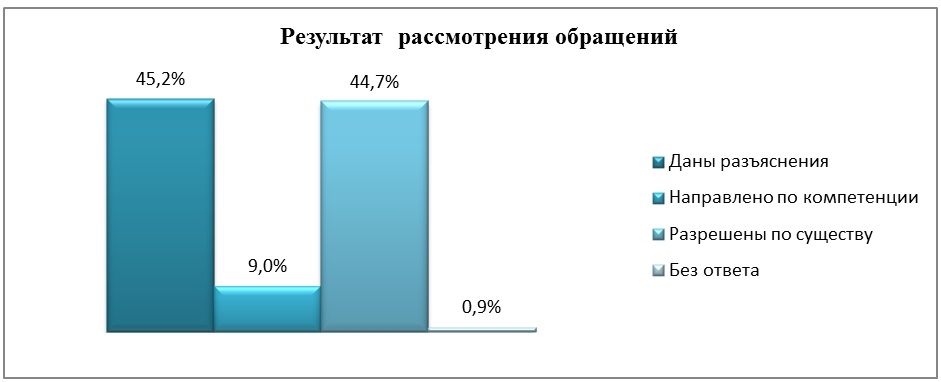 - 31 (1%) обращение оставлено без ответа в соответствии со ст.11 Федерального закона от 2 мая 2006 года № 59 «О порядке рассмотрения обращений граждан Российской Федерации».