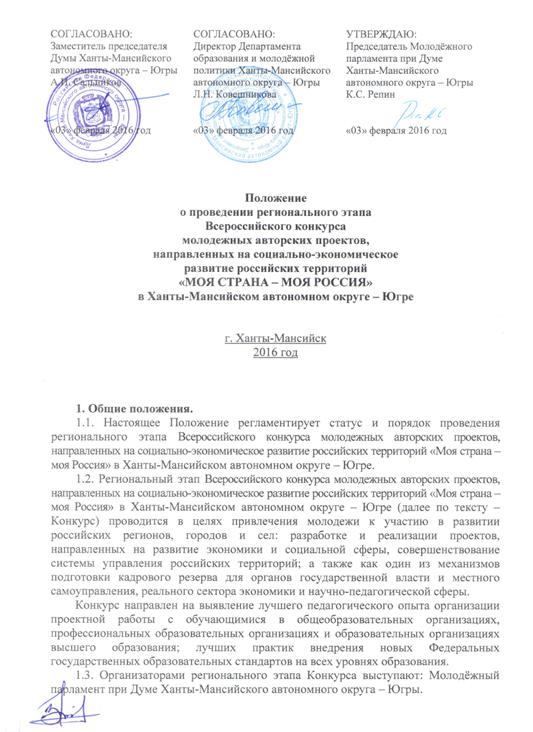 1.1. Настоящее Положение регламентирует статус и порядок проведения регионального этапа Всероссийского конкурса молодежных авторских проектов, направленных на социально-экономическое развитие российских территорий «Моя страна – моя Россия» в Ханты-Мансийском автономном округе – Югре.