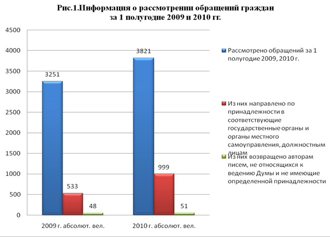 Как видно и таблицы и рисунков в 1 полугодие 2010 года в адрес депутатов Думы Ханты-Мансийского автономного округа - Югры поступило 3 821 обращение граждан, что на 17,5 процента превышает число обращений за аналогичный период прошлого года (3 251).